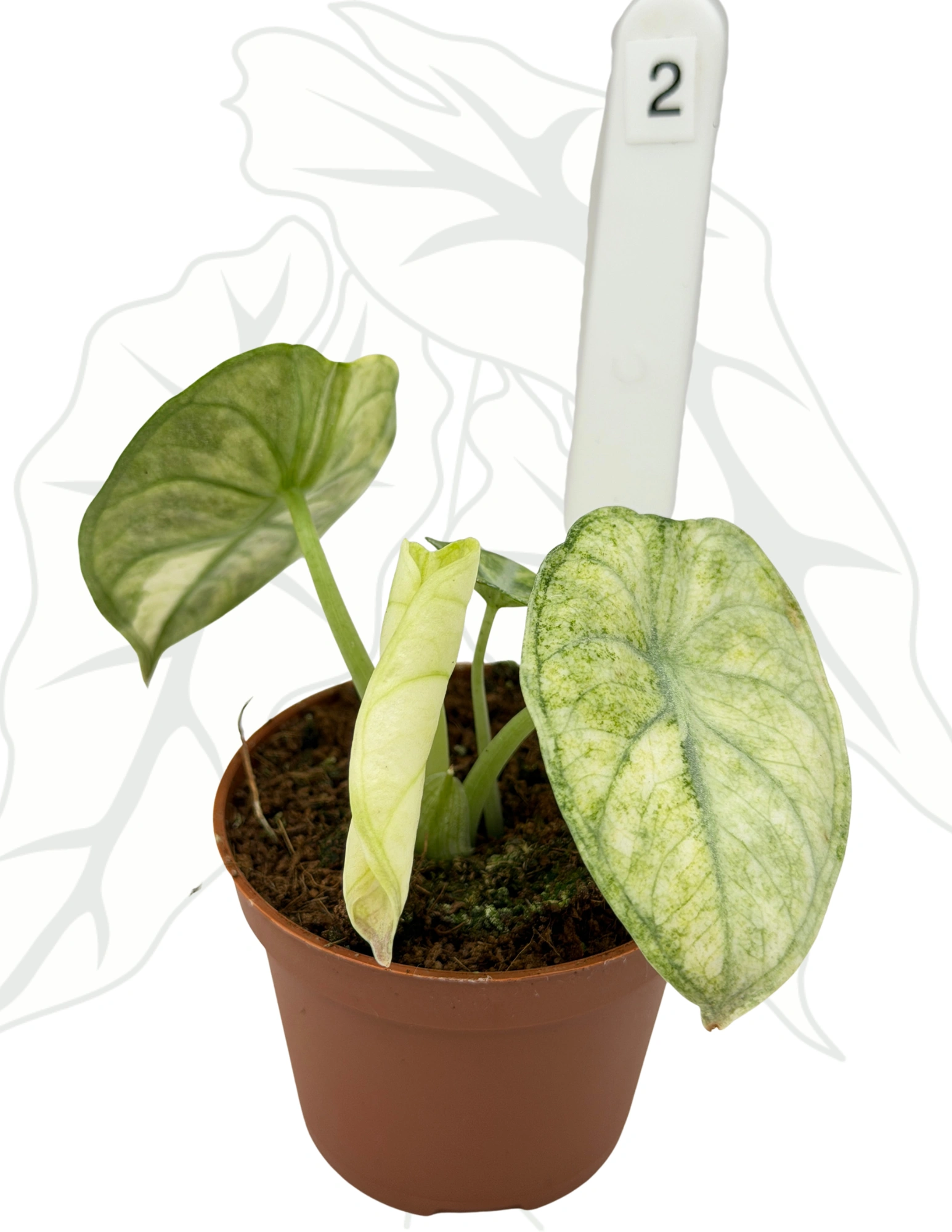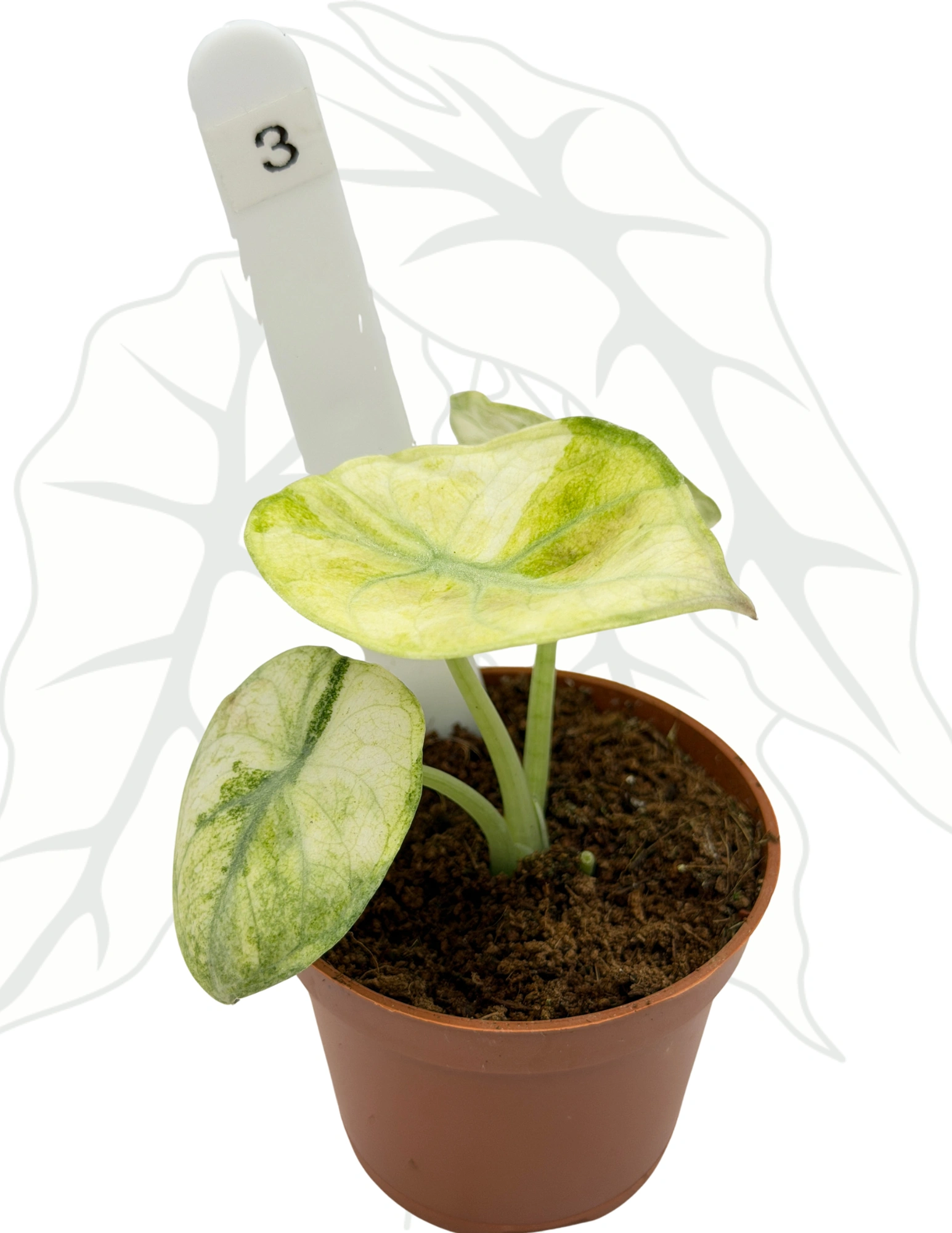 Alocasia Ninja Tricolor to niezwykła, kolekcjonerska odmiana o liściach zdobionych spektakularną, trójkolorową mozaiką. Połączenie głębokiej zieleni, kremowych akcentów i jasnych białych plam tworzy efekt, który trudno przeoczyć. Każdy liść jest małym dziełem sztuki – unikalnym, niepowtarzalnym i pełnym charakteru.