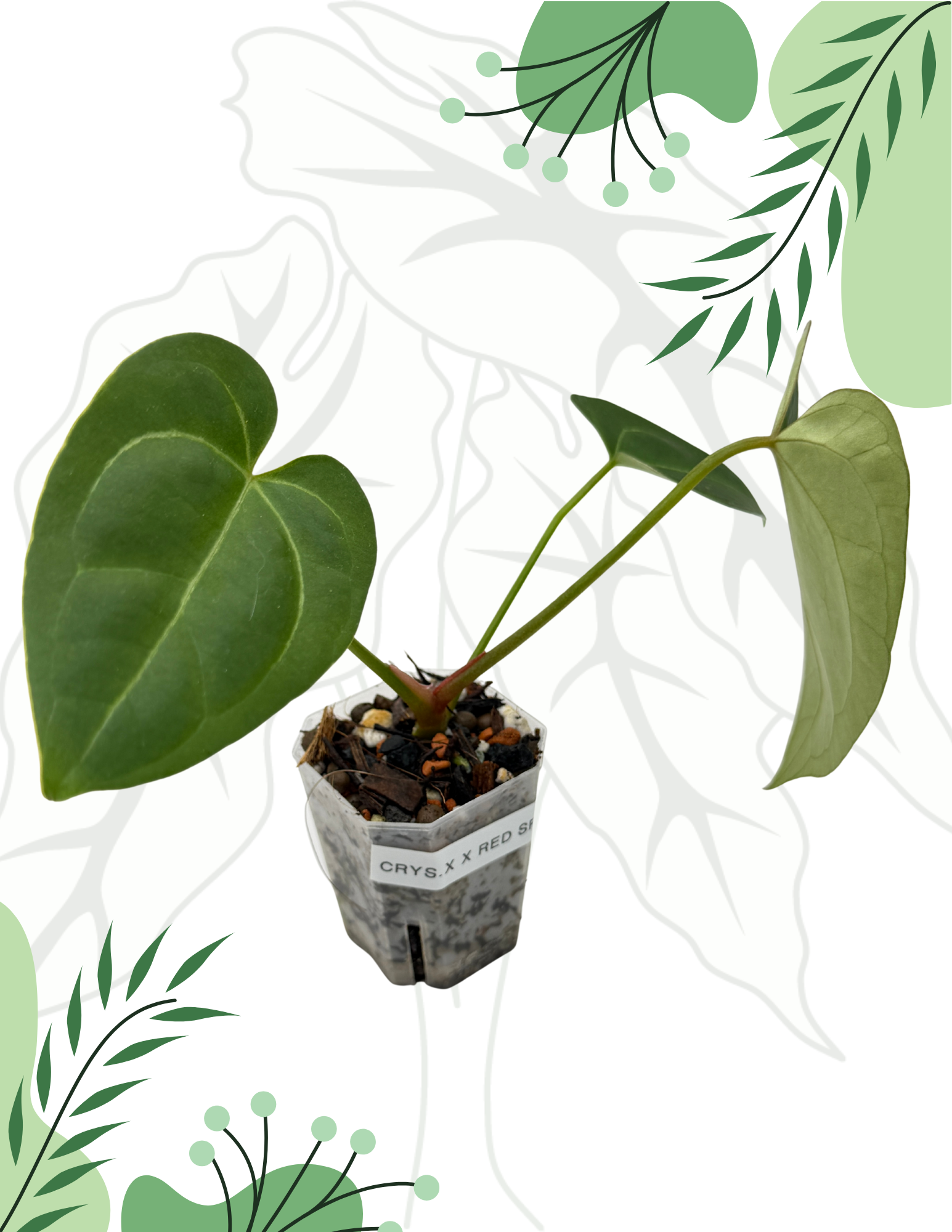 Anthurium Crystallinum X x Red Spider to niezwykle efektowna hybryda, która łączy w sobie najlepsze cechy obu rodziców: elegancję i błyszczące liście Crystallinum oraz intensywne, wyróżniające się wybarwienie charakterystyczne dla Red Spider. Ta roślina kolekcjonerska zachwyci każdego miłośnika unikalnych okazów tropikalnych.