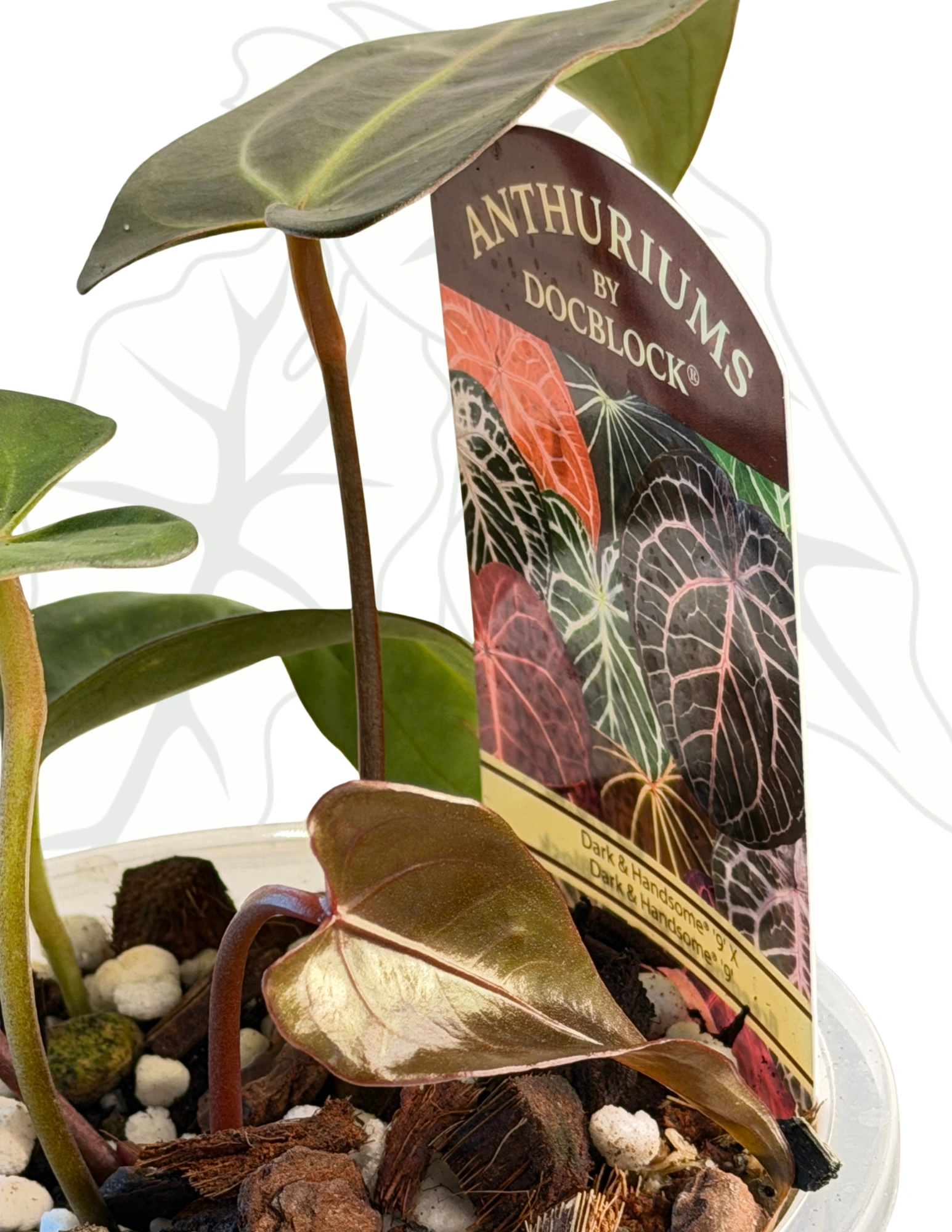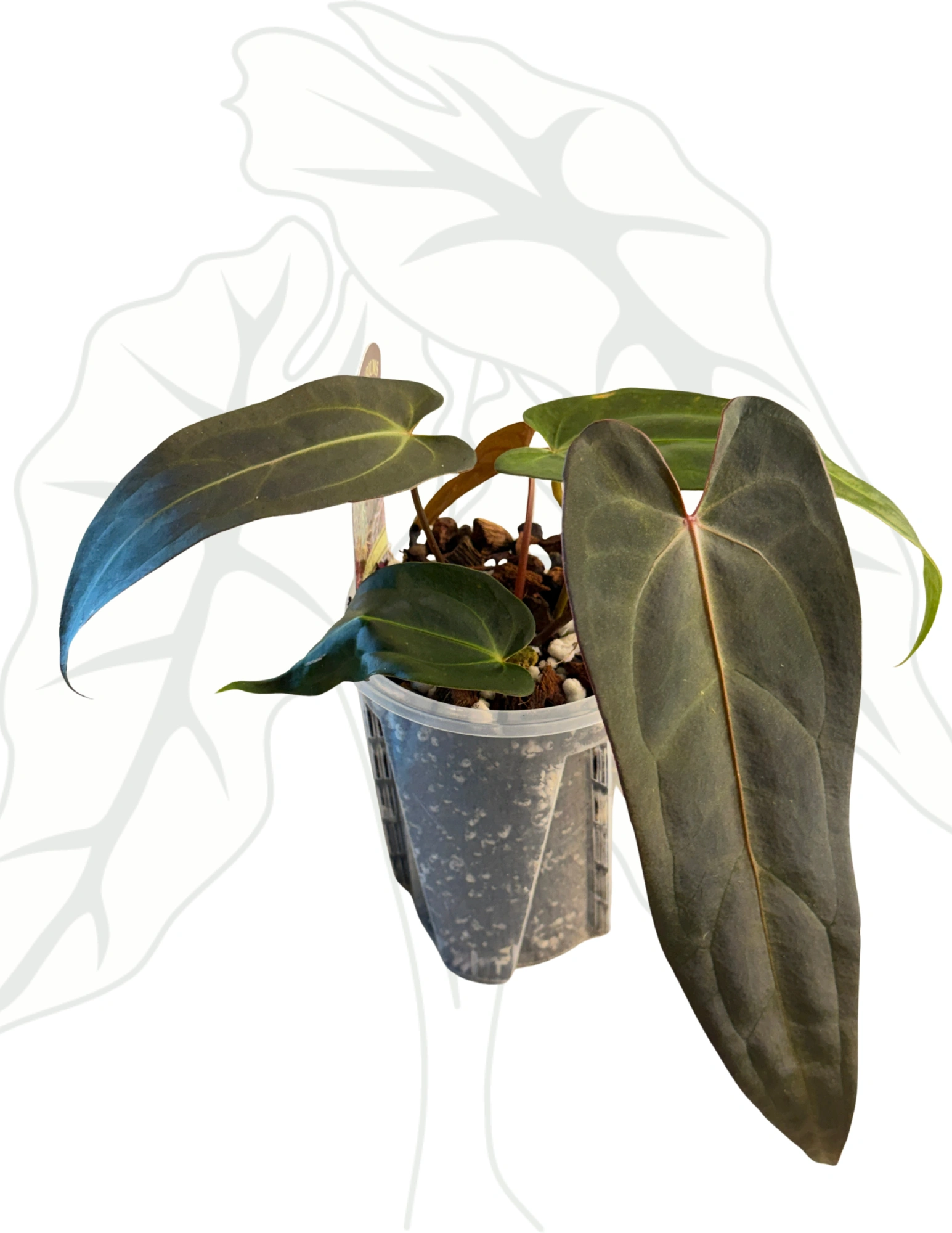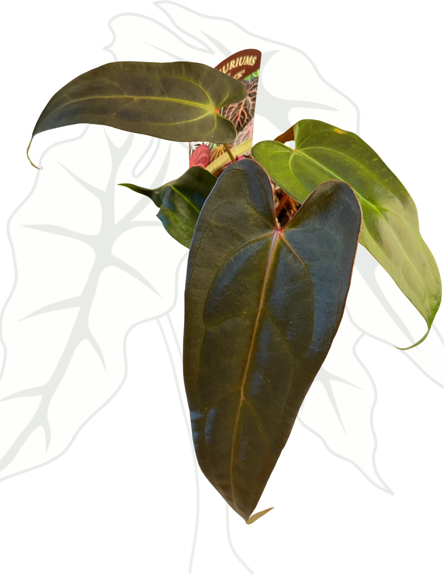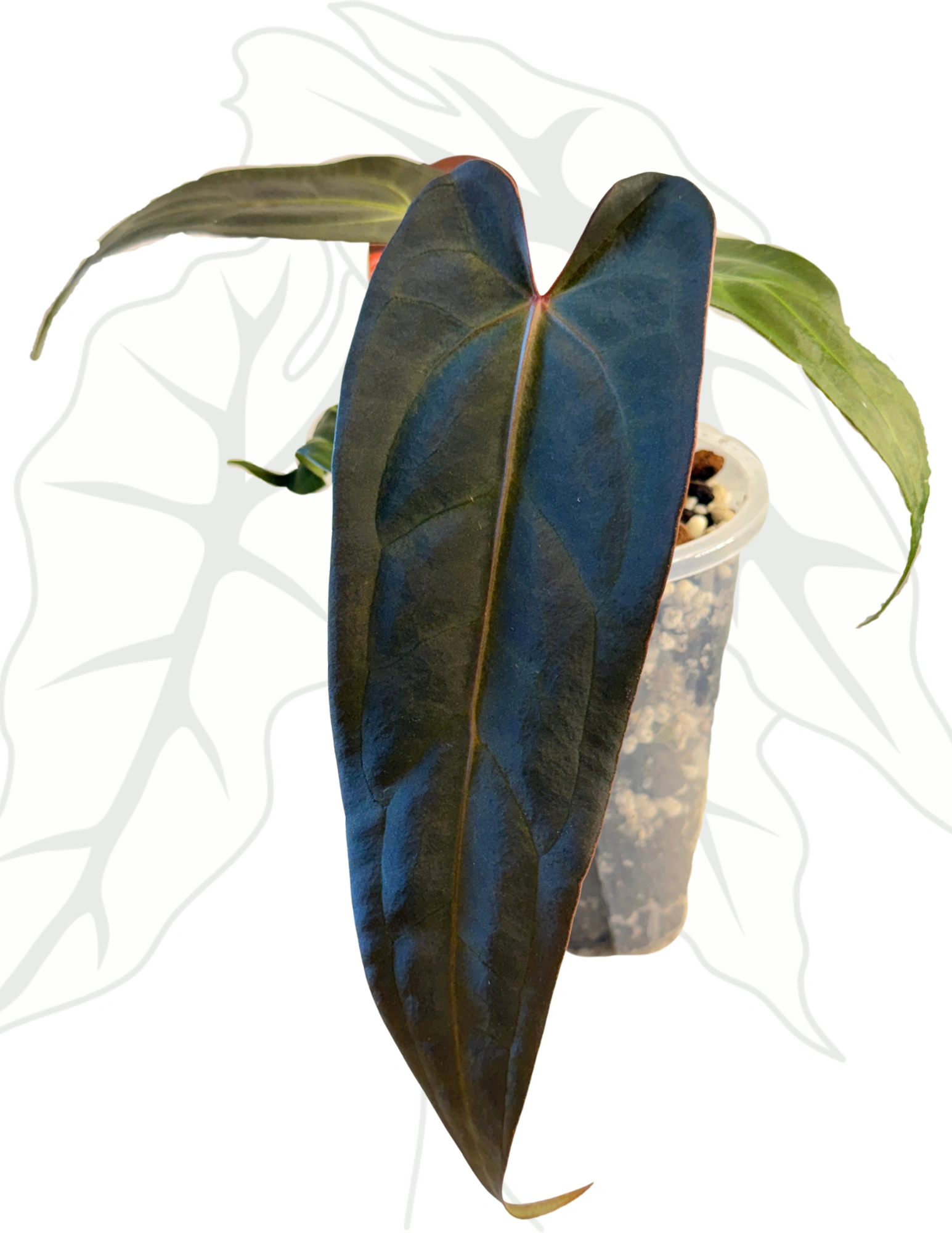 To wyjątkowe anthurium to efekt skrzyżowania dwóch niezwykłych odmian: Dark & Handsome „9” oraz Red Velvet Cake „24”. Hybryda łączy cechy obu rodziców – ciemne, satynowe liście o intensywnym kolorze z aksamitnym wykończeniem oraz silny, elegancki pokrój. Roślina wyróżnia się nie tylko wyglądem, ale także potencjałem kolekcjonerskim.