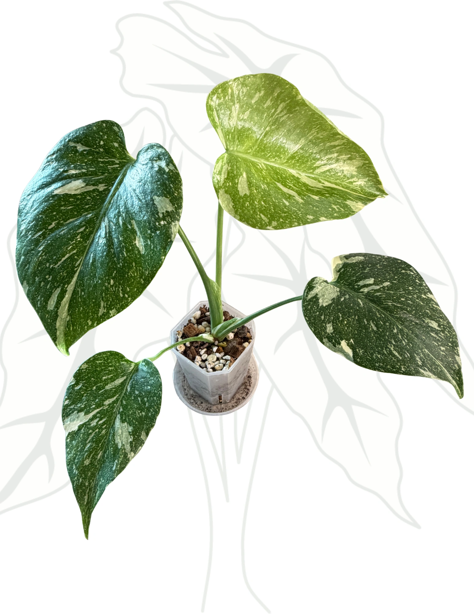 Liście: Duże, sercowate, z charakterystycznymi perforacjami i unikalną, stabilną wariegacją w odcieniach bieli i kremu.